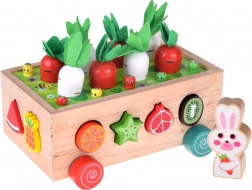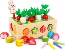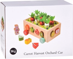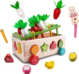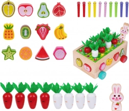 Houten karretje met sorteergaten; gekleurde bovendekplaat voor worteltjes en wormpjes; set fruitvormen; 8 groenten (4 wortels, 4 “peterselie/radijsjes”); 10 wormpjes in 5 kleuren; konijnenfiguur