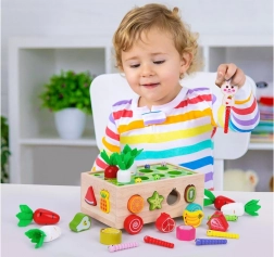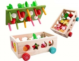 Ontdek een leuke en educatieve speelgoedset voor de allerkleinsten: een houten Montessori karretje met tuintje, vormen en magnetische wormpjes. Kinderen zullen worteltjes uittrekken, wormpjes vangen met een magnetisch konijntje en fruitvormen sorteren – allemaal met veilig, glad afgewerkt hout en niet-giftige verf. Het spel ontwikkelt fijne motoriek, oog-handcoördinatie, herkenning van vormen en kleuren en sensorische waarneming.