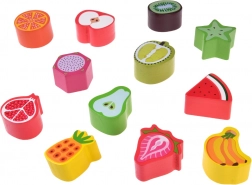 De set bevat een reeks kleurrijke fruitstukjes om in de bijbehorende openingen te plaatsen. Kinderen leren kleuren, vormen en fruitnamen en oefenen hun logisch denken.