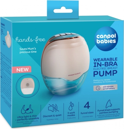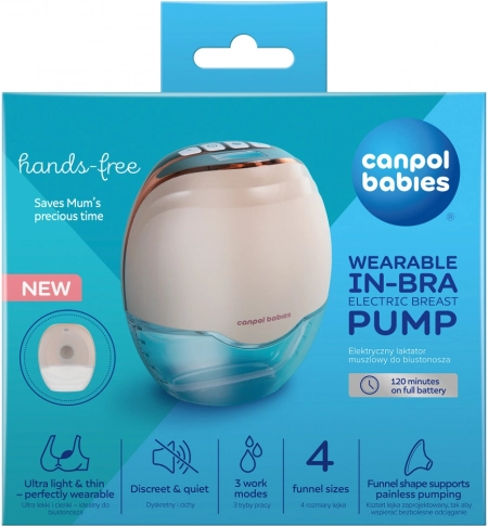 CANPOL babies Hands‑Free is een draadloze elektrische borstkolf ontworpen voor actieve moeders. Dankzij het compacte ontwerp past hij in de bh, werkt stil (max. 50 dB) en biedt bewegingsvrijheid thuis, op het werk en onderweg. Drie modi bootsen het natuurlijke zuigritme van de baby na en in elk daarvan kun je 8 intensiteitsniveaus kiezen tot 26 kPa voor maximaal comfort.