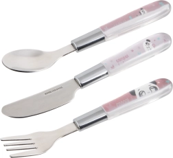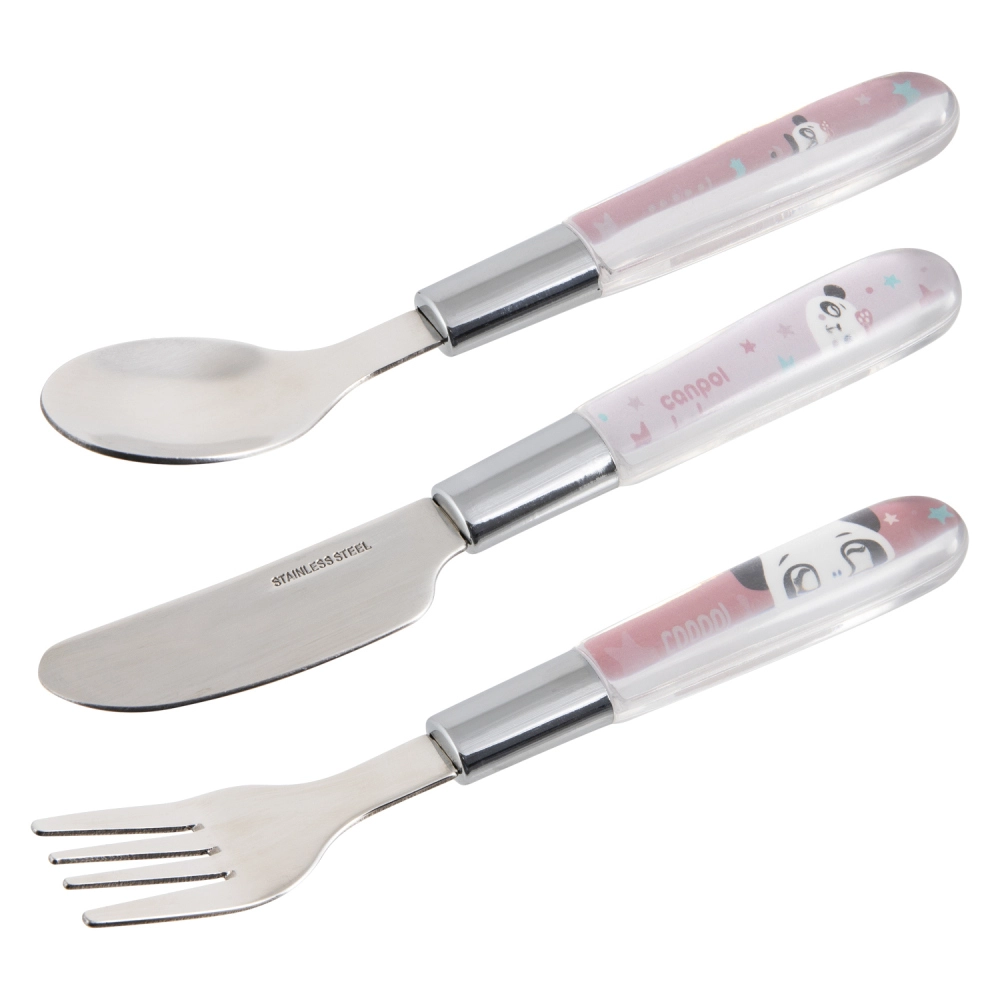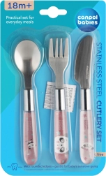Praktische set metalen kinderbestek voor zelfstandig eten, bestaande uit een mes, vork en lepel. Dankzij de afgeronde vormen zacht voor gevoelige tandvlees en veilig voor kinderen. Gemaakt van hoogwaardige roestvrij staal, ideaal voor kinderen vanaf 18 maanden. Het EXOTIC ANIMALS-motief en de roze uitvoering zullen elke kleine eter blij maken.