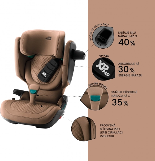 De premium autostoel BRITAX RÖMER Kidfix Pro Lux in de kleur Warm Caramel biedt je kind van 100 tot 150 cm maximale veiligheid en comfort. Hij heeft een XP-PAD voor bescherming van nek en borst, SecureGuard voor de juiste geleiding van de heupgordel, geavanceerde zijbescherming SICT, een ergonomische V‑vormige hoofdsteun en een smal design (44 cm) voor 3 stoelen naast elkaar. Bekleding van duurzame, luxe stoffen en rugventilatie verhogen het comfort, ook op lange ritten.