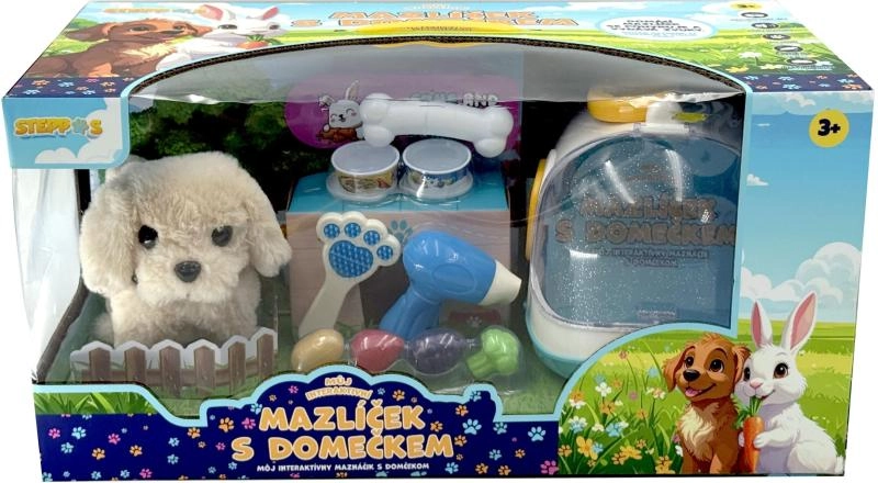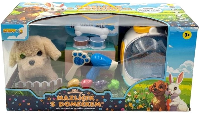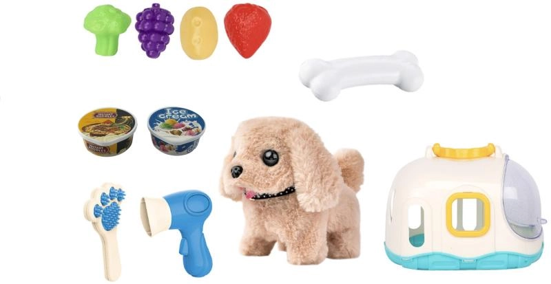 Het praktische huisje dient zowel als knus onderkomen als draagkoffertje, zodat kinderen het hondje overal mee naartoe kunnen nemen. In de verpakking zit ook verzorgingsaccessoire – een kam en een föhn – en plastic lekkernijen in de vorm van fruit en groenten om voerspelletjes te spelen.