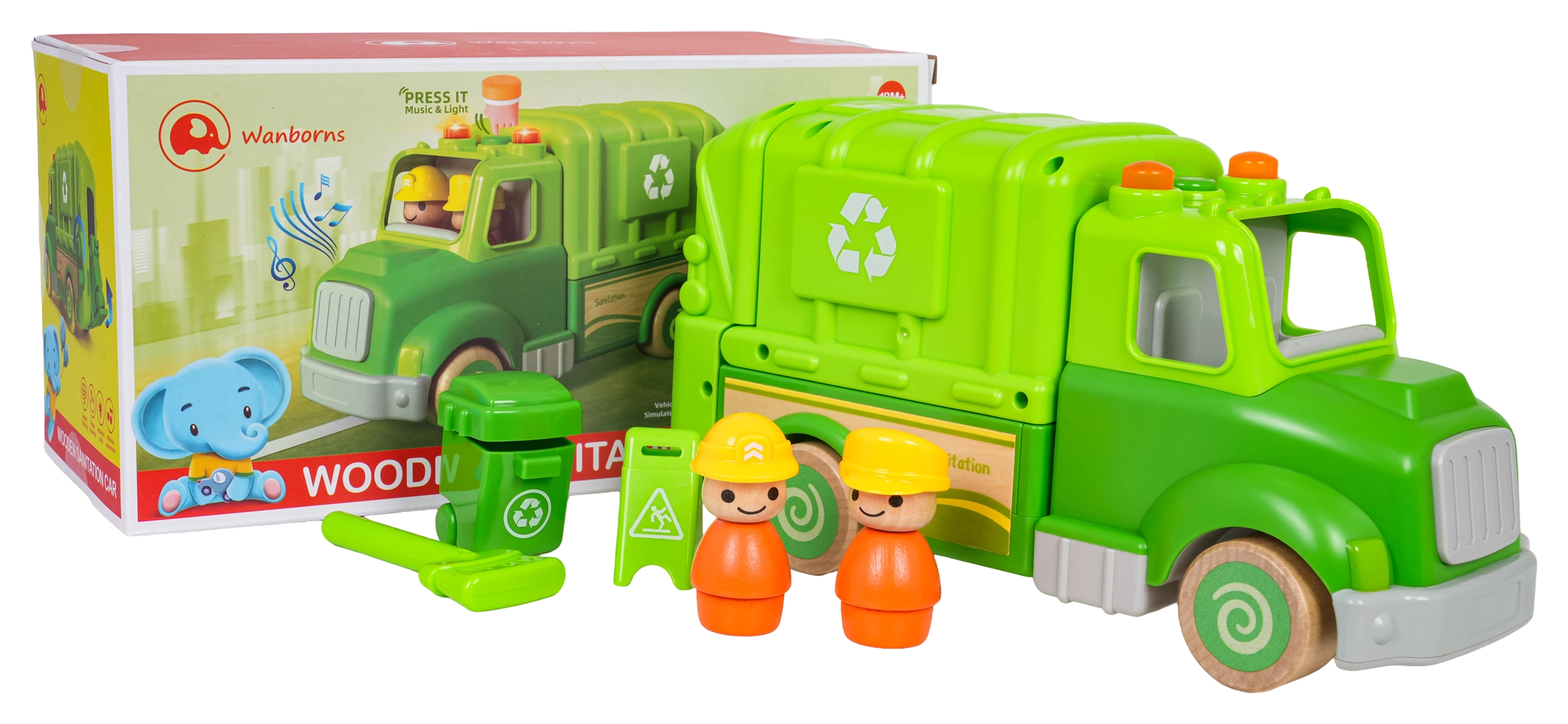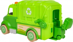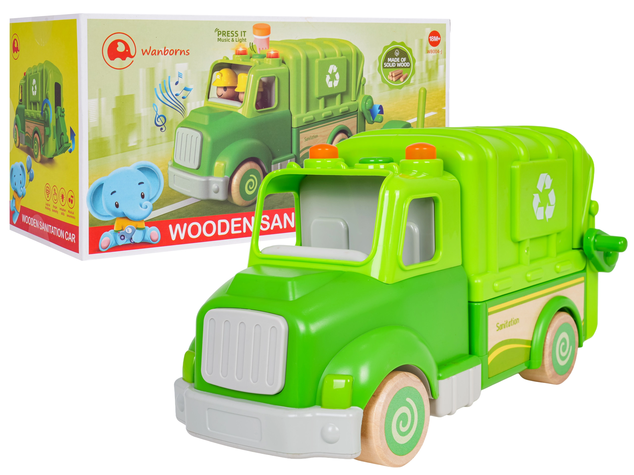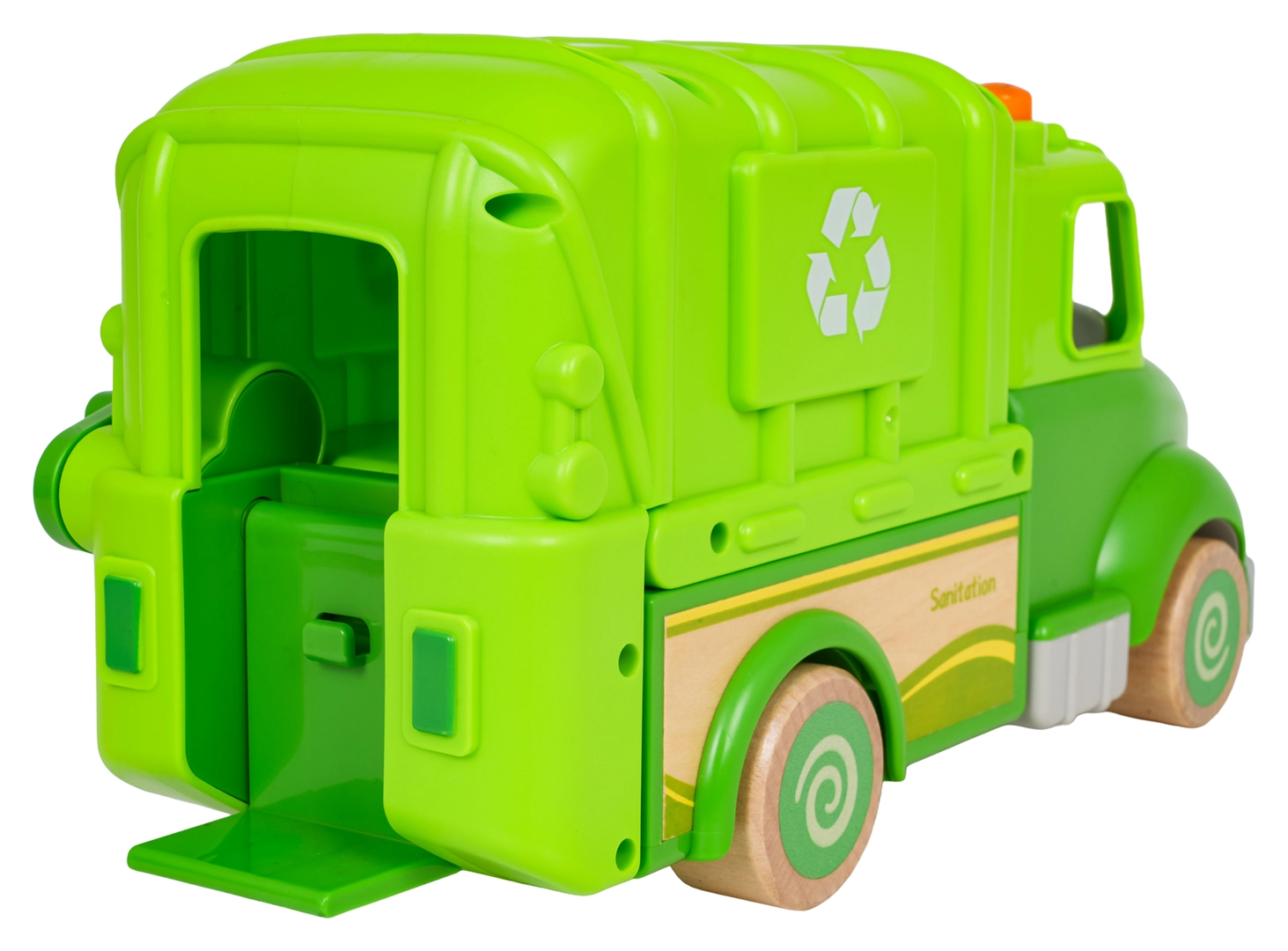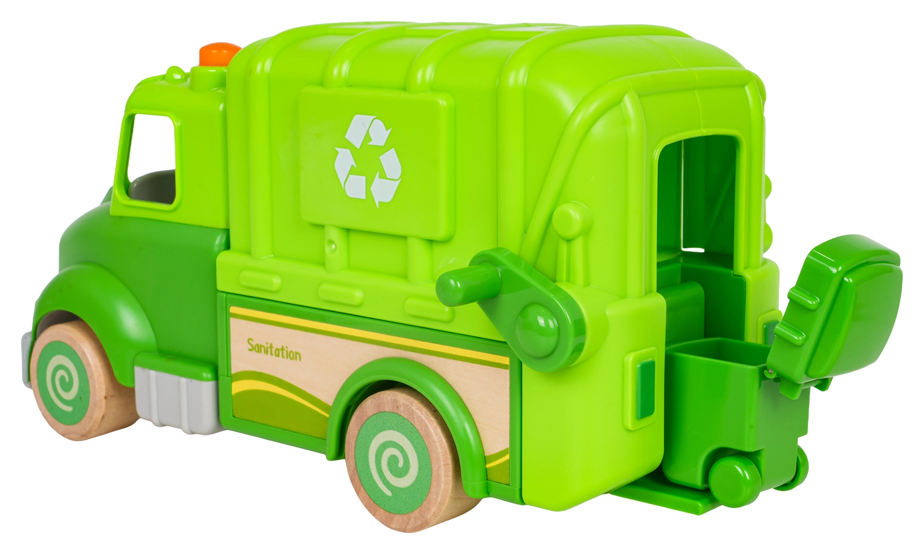 Deze groene vuilniswagen is ontworpen voor veilig en creatief spel. Afgeronde vormen, houten wielen en een stevige constructie van hout en kunststof maken het een ideale speelgoedauto voor kinderen. Op het dak zit een knop die melodieën, rij-, start- en toetergeluiden activeert, aangevuld met knipperende lampjes.
