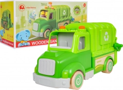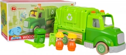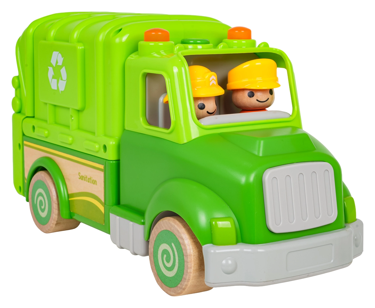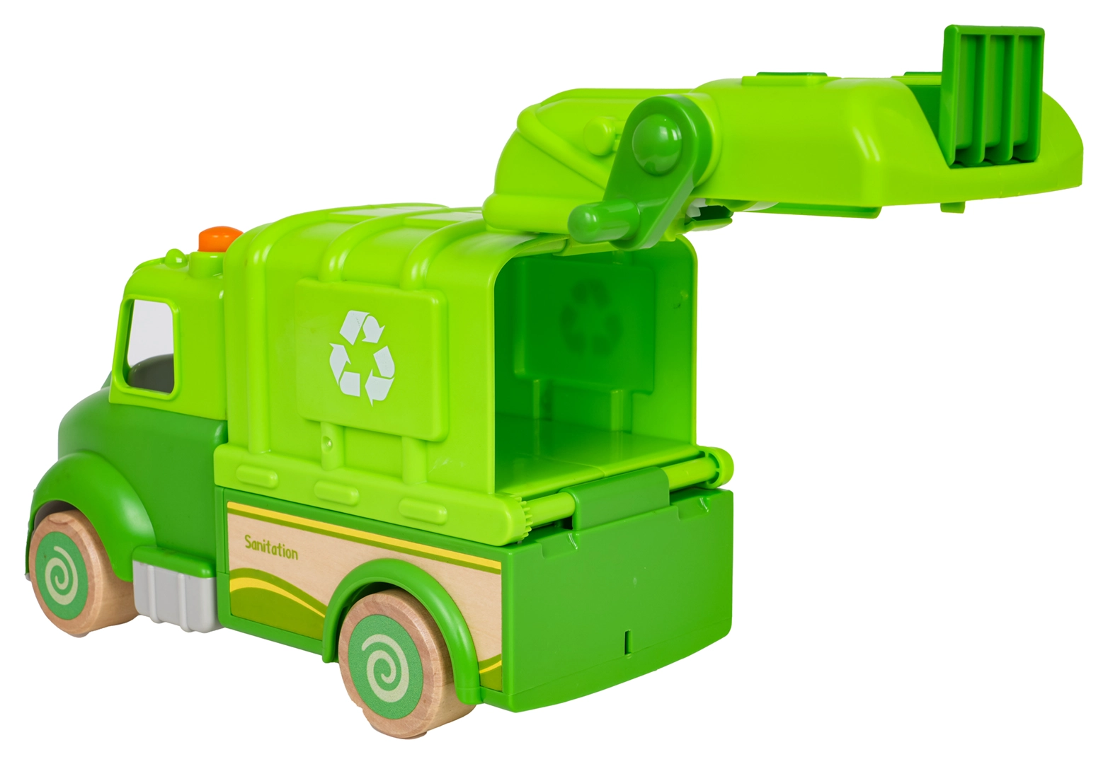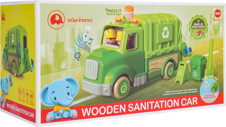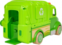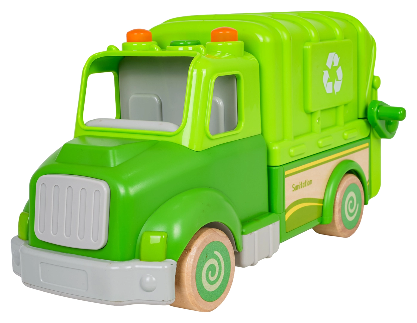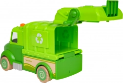 Deze groene vuilniswagen is ontworpen voor veilig en creatief spel. Afgeronde vormen, houten wielen en een stevige constructie van hout en kunststof maken het een ideale speelgoedauto voor kinderen. Op het dak zit een knop die melodieën, rij-, start- en toetergeluiden activeert, aangevuld met knipperende lampjes.
