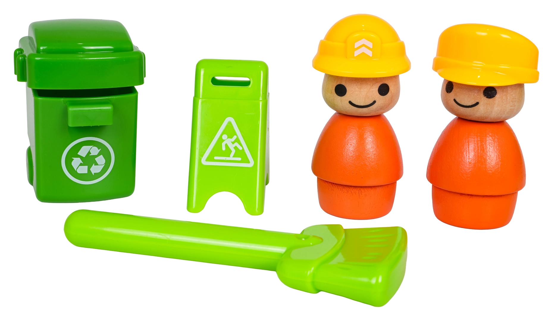 Inclusief 2 figuurtjes, een afvalbak, een waarschuwingsbord en een bezem. Alles in een veilig ontwerp met heldere kleuren.