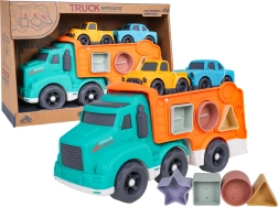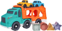 Kleurige bergingswagen van bioplastic die een autotransporter en een vormensorteerder in één speeltje combineert. Bevat 2 autootjes en 4 vormen, heeft rijdbare wielen, een duurzame constructie en een afkoppelbare aanhanger. Geschikt voor kinderen vanaf 18 maanden, veilig en ecologisch – ideaal voor binnen en buiten.
