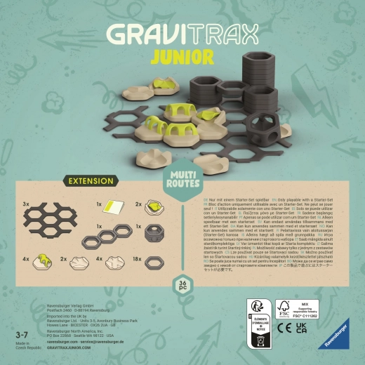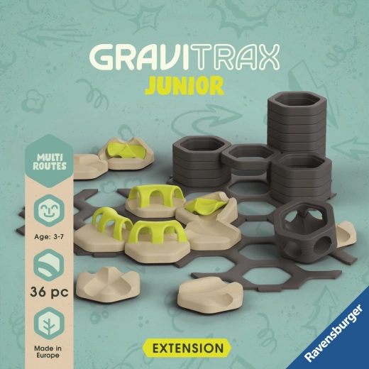 De uitbreiding biedt meer manieren om de knikkers in verschillende richtingen te leiden en verrassende routes te bouwen. Ideaal om bestaande GraviTrax Junior-sets uit te breiden en stimuleert creatief en zelfstandig spel voor kinderen vanaf 3 jaar.