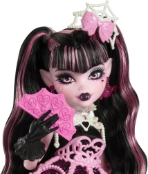 Draculaura nodigt je uit voor het meest angstaanjagend zoete feest van de eeuw! Deze iconische monster-girl verschijnt in een prachtige goth-outfit met roze en zwarte details, aangevuld met thematische accessoires – van een hartvormige ballon met vleermuisvleugels tot een stijlvolle handtas en kam. Dankzij de gelede constructie is de pop eenvoudig te poseren en te displayen.