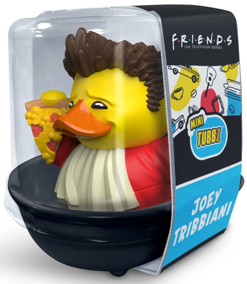 Het mini TUBBZ-eendje uit de cultserie Friends brengt Joey Tribbiani in een schattig, gedetailleerd eend-design. Dankzij de compacte hoogte van 5,5 cm is het ideaal voor kleine vitrines, je bureau of als kleine attentie voor liefhebbers van de serie.