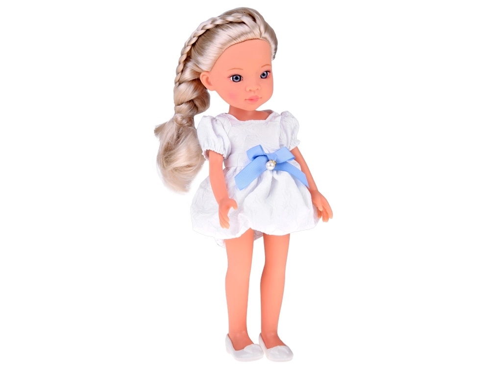 Inclusief een charmante witte jurk met blauwe strik en subtiele parelversiering en witte ballerina’s. Het gedetailleerd gevormde gezicht met opvallende, glinsterende ogen geeft de pop een realistische uitstraling en maakt haar tot een prachtige metgezel voor de kinderkamer én voor verzamelaars.