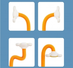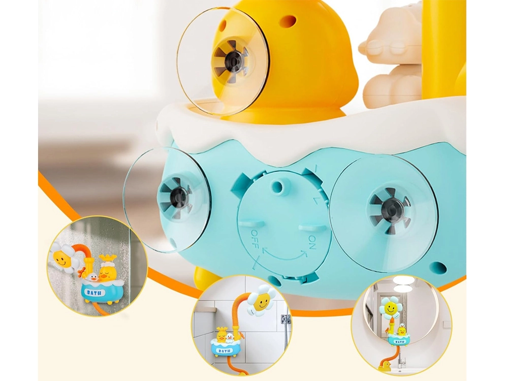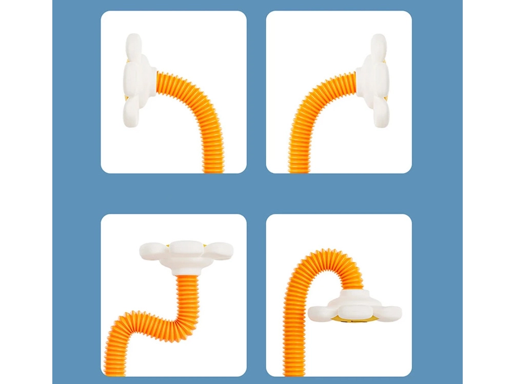 De praktische flexibele slang laat je de stroomrichting precies richten waar nodig, en de verwisselbare opzetstukken creëren verschillende fonteineffecten – van zachte motregen tot speels gespetter. Stevige zuignappen houden de set op zijn plek, zowel op gladde tegels als op de rand van het bad.