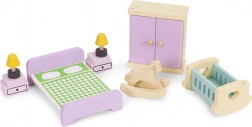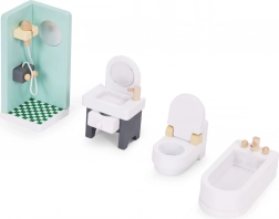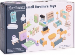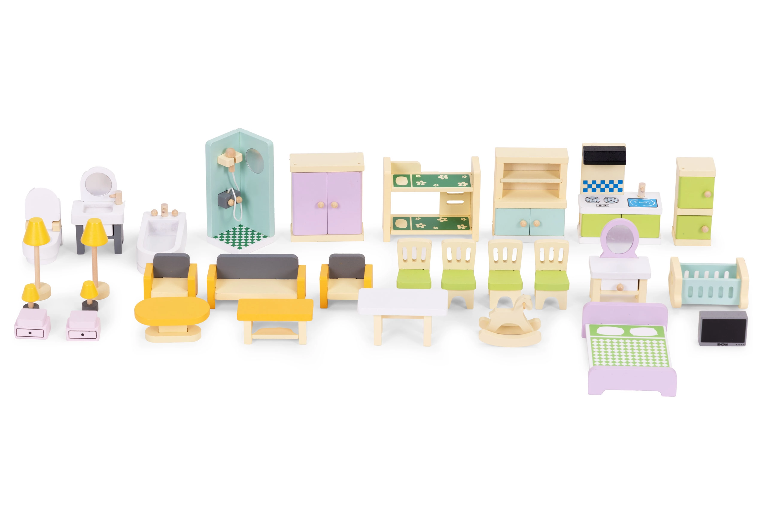 Stijlvolle set van 30 houten meubelstukken voor de inrichting van woonkamer, slaapkamer, keuken, badkamer en eetkamer. Ideaal voor kleinere poppen en compacte poppenhuizen. Veilige afgeronde randen, duurzame afwerking en eenvoudig onderhoud ondersteunen creatief spel, samenwerking en de ontwikkeling van de fijne motoriek bij kinderen vanaf 3 jaar.