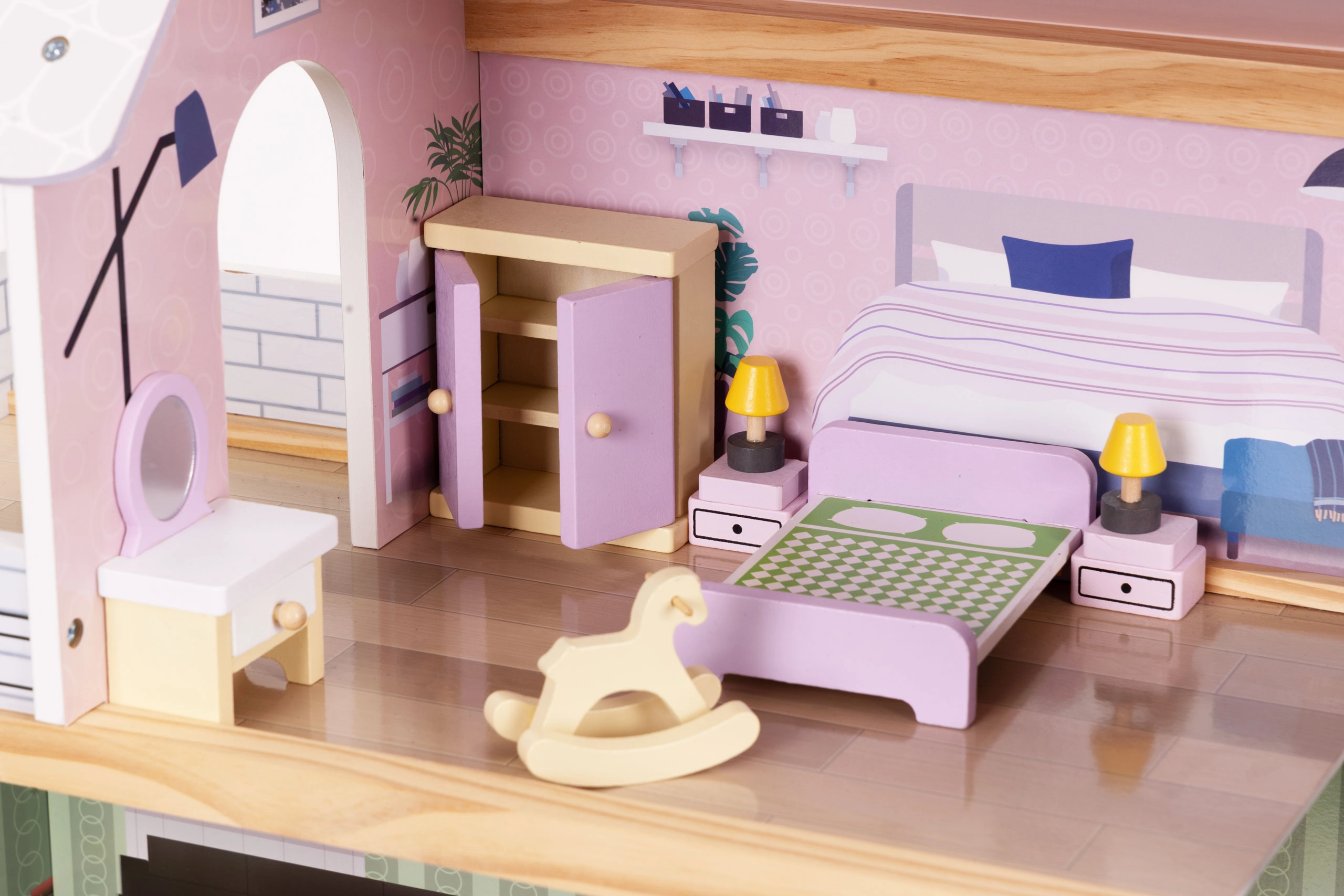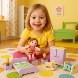 Deze veelzijdige set verandert elke kinderkamer in een creatieve speelwereld. Dankzij de houten uitvoering met afgeronde randen zijn de meubels duurzaam, veilig en aangenaam om aan te raken. Kinderen kunnen de onderdelen gemakkelijk verplaatsen en combineren, hun eigen verhalen maken en planning en sociale vaardigheden oefenen.