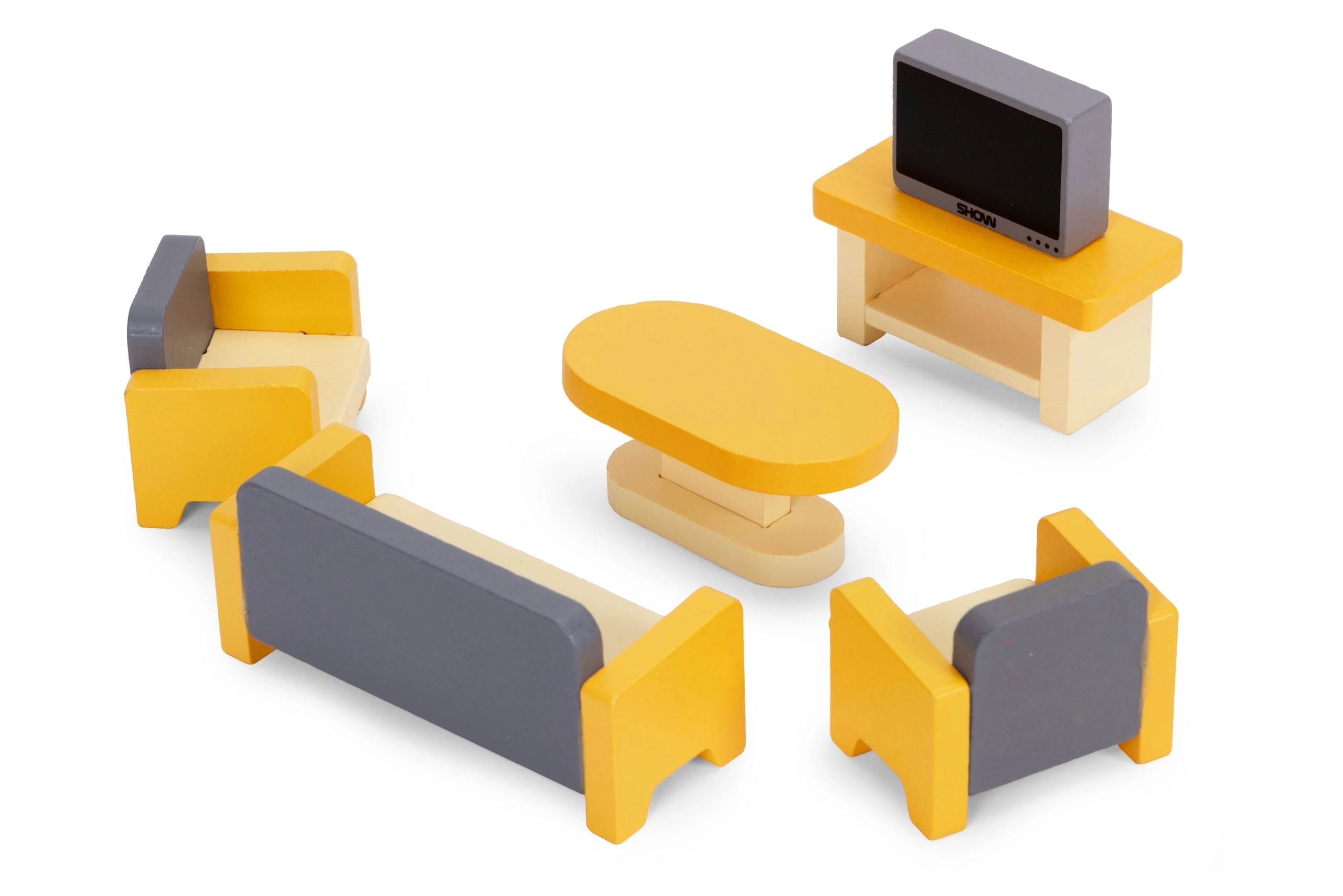 De praktische samenstelling voor het hele poppenhuis omvat de inrichting van woonkamer, badkamer, slaapkamer, keuken en eetkamer. De onderdelen zijn afgestemd op kleinere poppen en passen ook in kleinere ruimtes – en functioneren net zo goed als een losse set voor vrij spel.