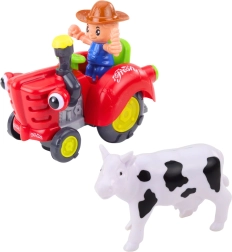 Deze kleurrijke en veilige tractor biedt kinderen leuk en leerzaam spel. Na het inschakelen rijdt de tractor vooruit en achteruit, gaan er lichtjes branden in de schoorsteen en “oogjes” en klinken vrolijke melodieën en een begroeting. Kinderen kunnen het koetje op de aanhanger vervoeren en hun eigen boerderijverhalen bedenken.