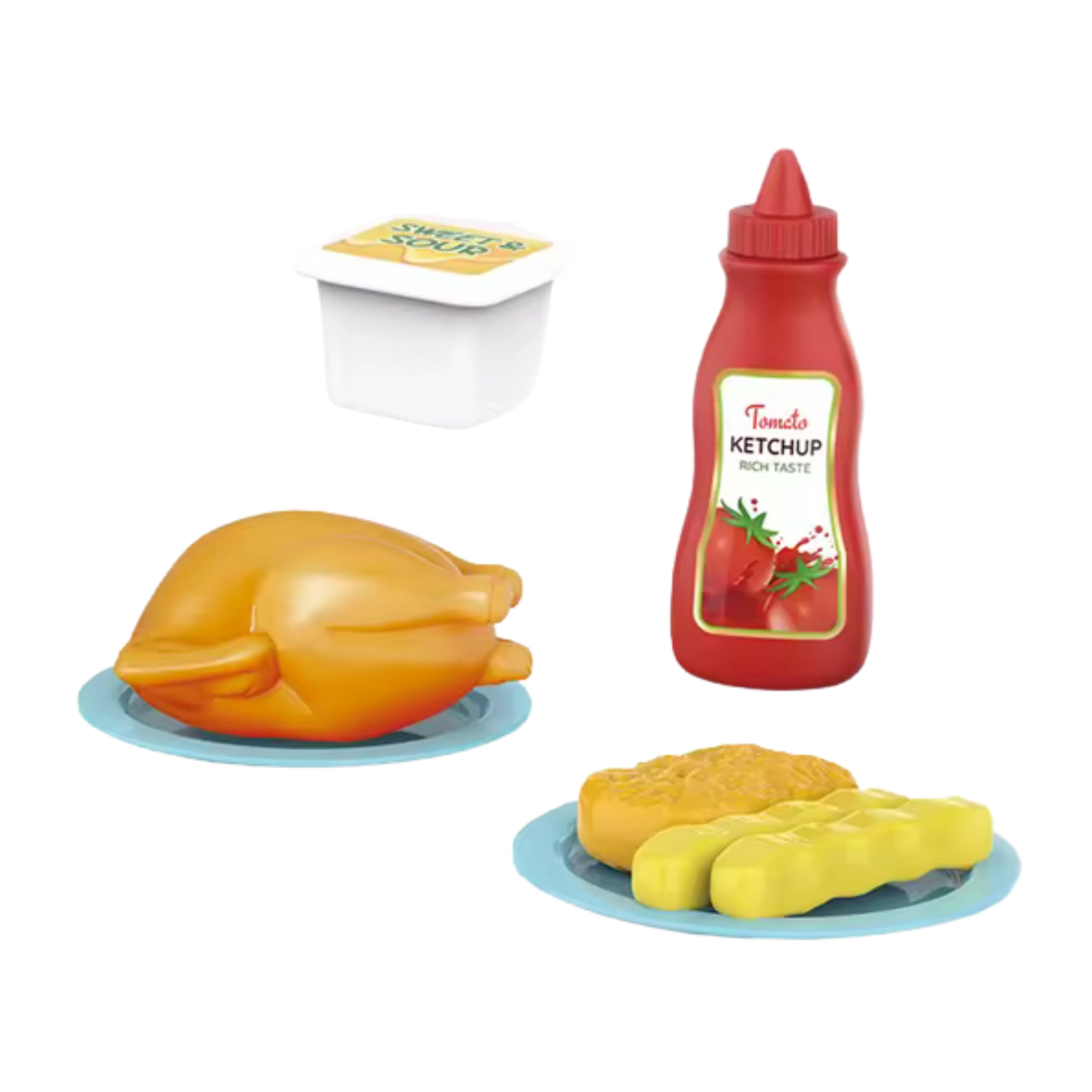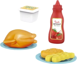 In de verpakking: interactieve magnetron, plastic kip, 2× frietjes, 1× nugget, bekertje met saus, ketchupfles, 2 bordjes.