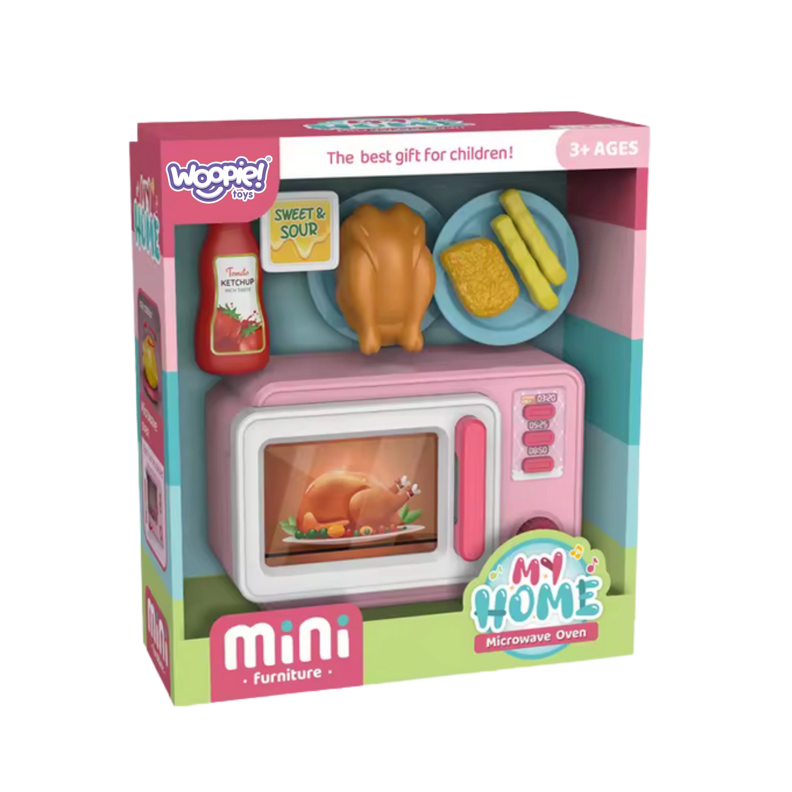 Deze interactieve magnetron is ontworpen om echte huishoudelijke apparaten getrouw na te bootsen – met een verlichte binnenruimte, realistische geluiden en een roterend plateau. Kinderen kunnen de tijd instellen, het deurtje openen, de kip, frietjes of nugget erin leggen en kijken hoe de magnetron “werkt”. Een geweldige keuze voor educatief spel en het oefenen van alledaagse handelingen.