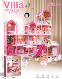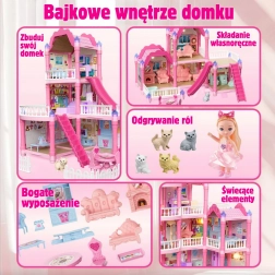 Ontdek een prachtig drie verdiepingen tellend poppenhuis in roze tinten met terras, glijbaan en een rijke uitrusting. De set bevat 296 onderdelen, inclusief stijlvolle accessoires en meubels, en er is ook een pop inbegrepen. Voor de avondstemming zorgt de nachtverlichting, die het spel een vleugje magie geeft. Ideaal speelgoed voor de ontwikkeling van creativiteit, fantasie en fijne motoriek.