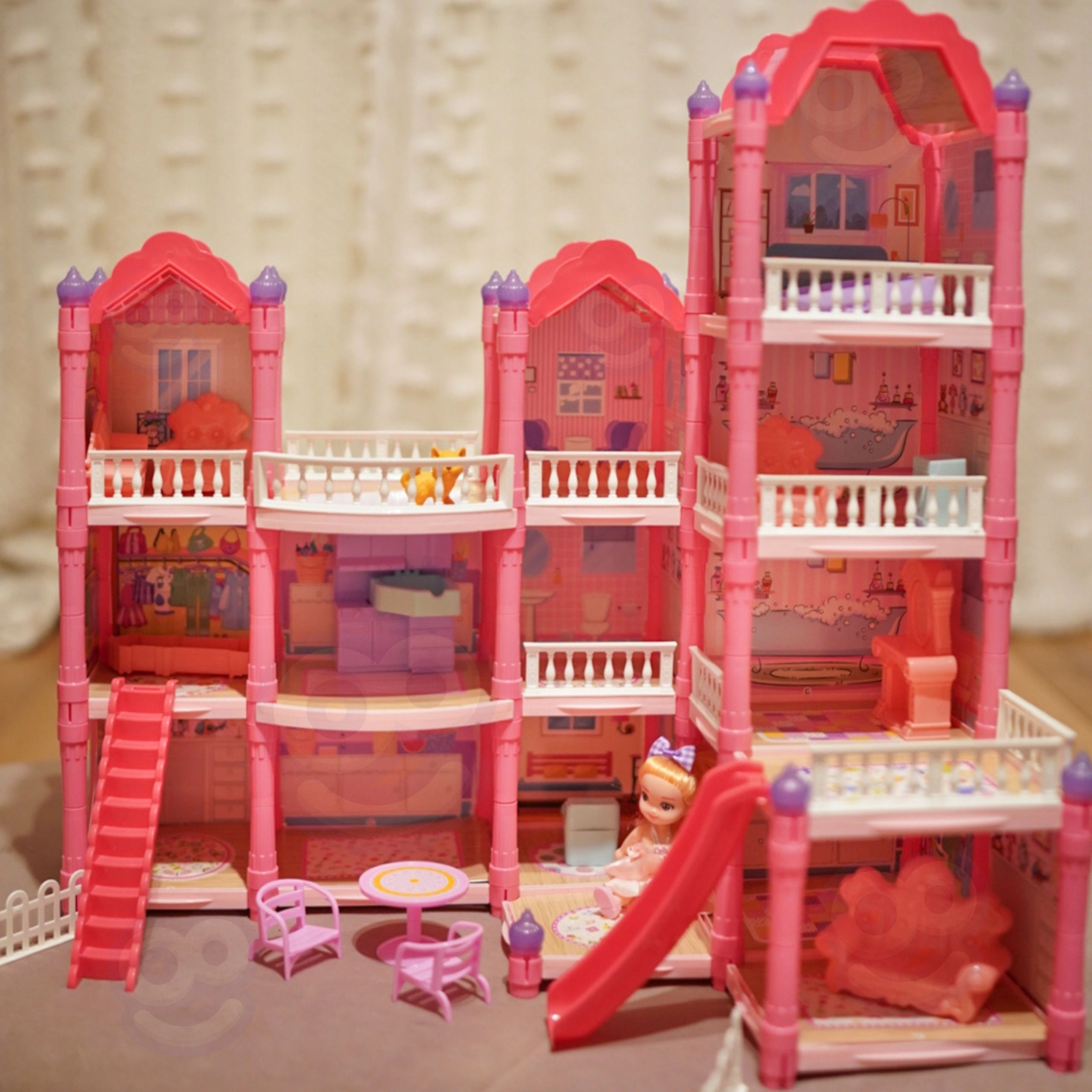 Ontdek het betoverende drie verdiepingen tellende poppenhuis met een roze dak, rijke inrichting en nachtverlichting. De set biedt 296 onderdelen, inclusief schattige meubels, accessoires en een pop, zodat kinderen elke kamer zelf kunnen inrichten. Glijbaan, trap en terras zorgen voor extra plezier en stimuleren creativiteit, verbeeldingskracht en fijne motoriek.