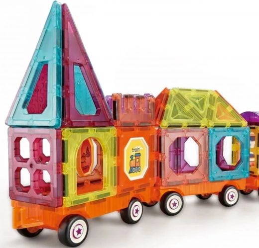 Ontdek de creatieve wereld van magnetisch bouwen. Gekleurde elementen met verschillende vormen en prints klikken snel en veilig vast, zodat kinderen direct locomotieven, wagons en originele voertuigen kunnen bouwen. De set motiveert tot creatief spel en ontwikkelt constructief denken.