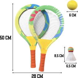 In de verpakking zit alles voor direct spel: 2 grote rackets, een schuimbal en een kleurrijke shuttle met zachte punt. Comfortabele schuimhandgrepen zijn antislip en liggen goed in kinderhanden. De set is perfect voor de tuin, binnenplaats, het strand en binnen.