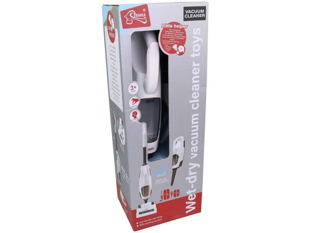 De lichte en duurzame constructie van kunststof is aangepast aan kinderhanden. De stofzuiger werkt op 3× AA 1,5 V-batterijen (niet inbegrepen) en is geschikt voor kinderen vanaf 3 jaar.