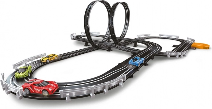Geniet van spannende races met een racebaan van in totaal 700 cm met twee banen, loopings en steile bochten. Inclusief 2 autootjes met 4 verwisselbare carrosserieën, 2 controllers en de mogelijkheid om te voeden met AA-batterijen of een netadapter (meegeleverd). Ideaal vermaak voor kinderen vanaf 6 jaar.