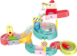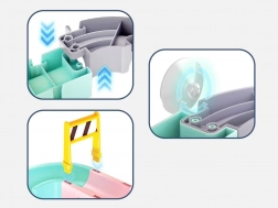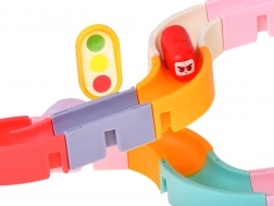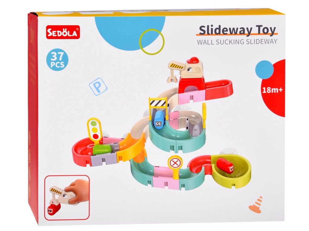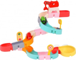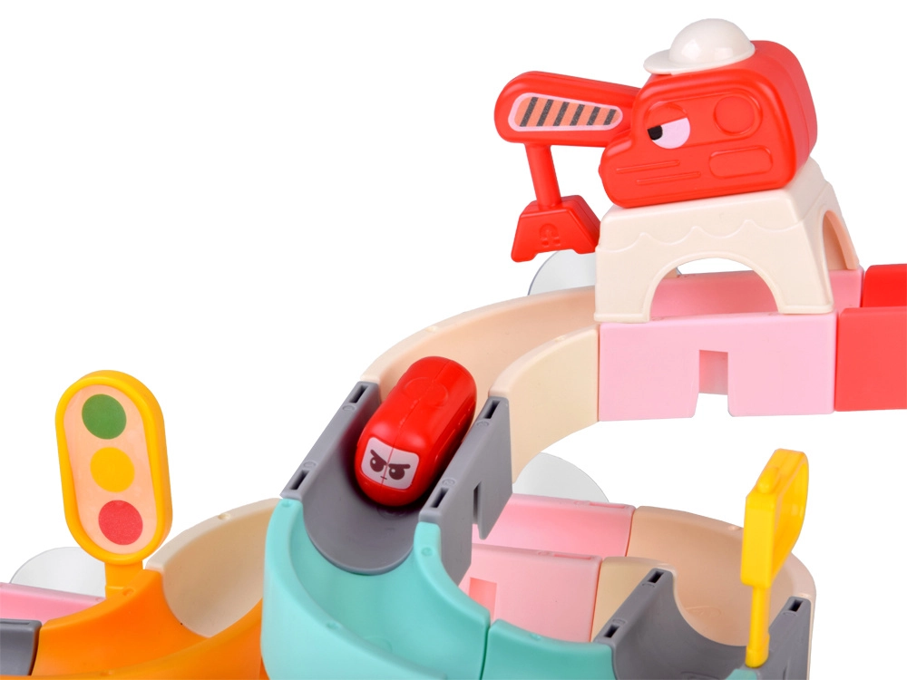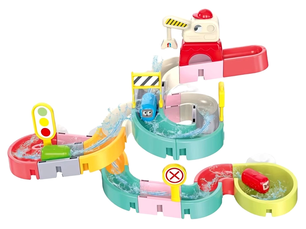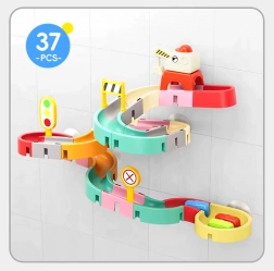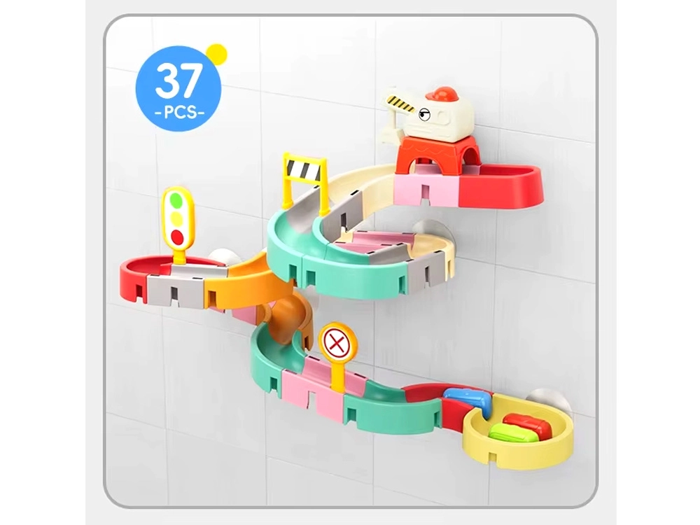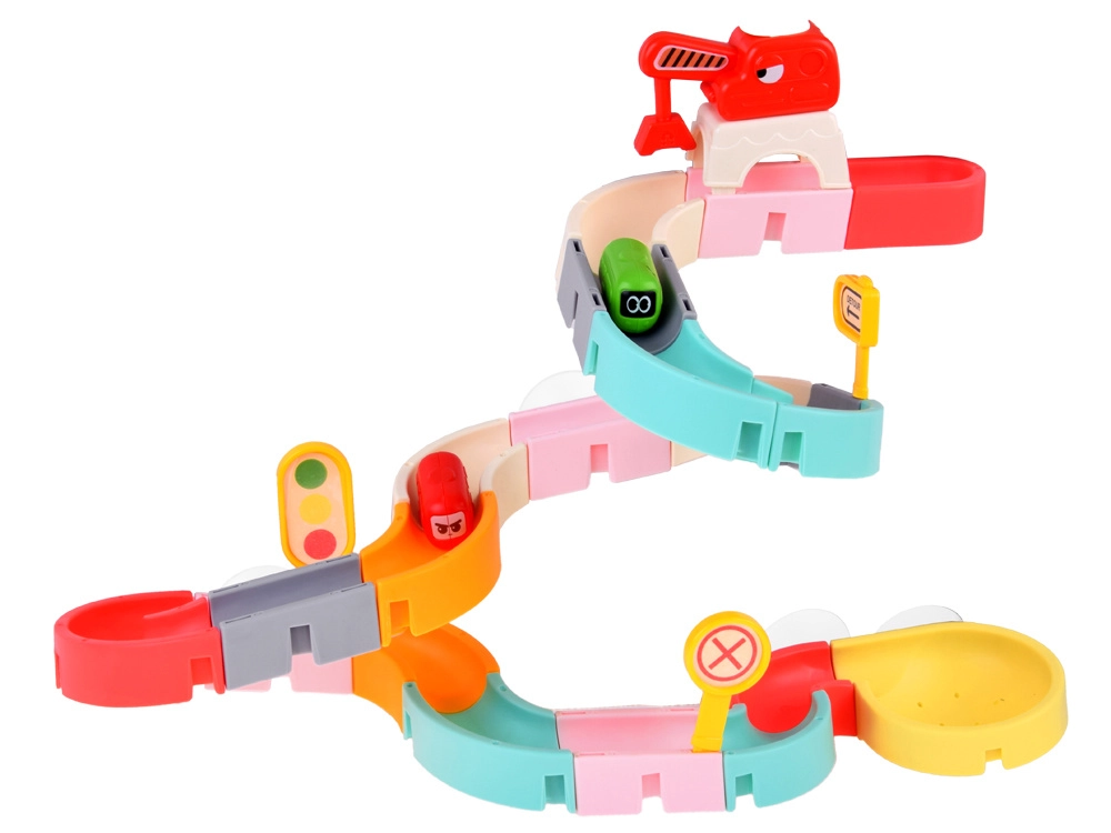 Deze creatieve badset boeit kinderen met kleurrijke onderdelen, een verkeersthema en watereffecten. Met 37 componenten bouw je bochtige goten en afdalingen waar capsule-autootjes met behulp van water drijven en rollen. Siliconen zuignappen houden de elementen stevig op gladde oppervlakken en het uiteinde met zeefje zorgt voor een leuke watersproeier.