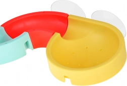 De gebogen goot en het uiteinde met zeefje creëren een mini-douche. Kinderen volgen de waterstroom en de beweging van capsule-autootjes over de baan.