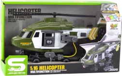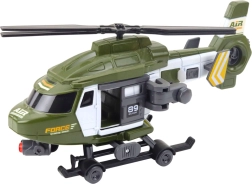 Realistische militaire helikopter op schaal 1:16 die kleine fans van de luchtvaart en het leger zal verrassen. Biedt licht- en geluidseffecten, draaibare rotors, wieltjes voor bewegen op de grond en een functionele haak met brancard voor reddingsmissies. Duurzame uitvoering van hoogwaardige kunststof en de militaire groene kleur versterken de authentieke uitstraling en lange levensduur van het speelgoed.