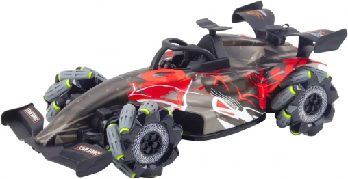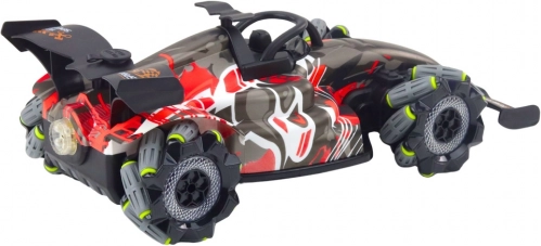 De speciale wielconstructie maakt beweging in alle richtingen en 360° rotaties mogelijk, zodat je dynamische trucs en precieze manoeuvres onder de knie krijgt. LED-lichten zorgen voor sfeer, vooral in schemerlicht. De auto wordt gevoed door een 3,7 V Li-ion accu (inbegrepen) en wordt opgeladen via USB. De controller vereist 2× AA (niet inbegrepen).