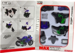 Ontdek het plezier van bouwen met dit stijlvolle DIY motorfietsmodel op schaal 1:14. Onderdelen van metaal en hoogwaardig kunststof garanderen een stevige en duurzame constructie, terwijl de opvallende groen‑blauwe kleurcombinatie het afgewerkte model een sportieve uitstraling geeft. Na montage is de motor zowel geweldig om mee te spelen als om te gebruiken als decoratie voor de kamer.