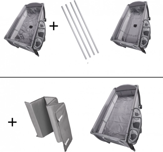 bedje, tweede niveau, matras met klittenband, kap met muskietennet en 3 speeltjes, 4 montagestangen, aankleedtafel, organizer, tas, handleiding