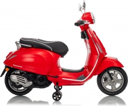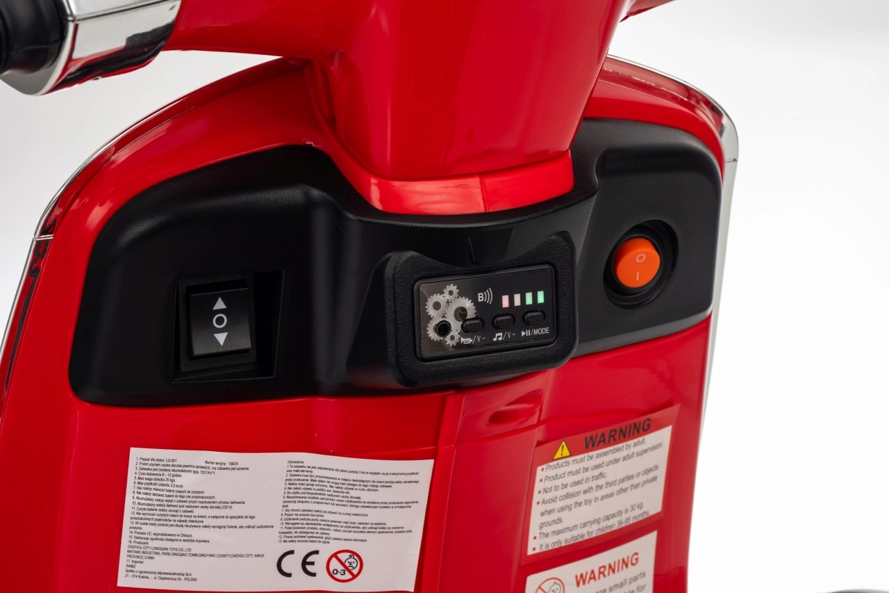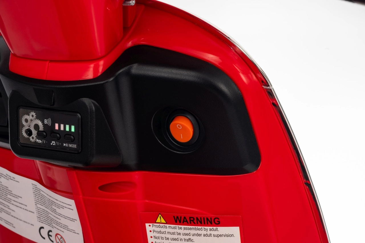 Stijlvolle elektrische kinderscooter in VESPA-stijl, die jonge bestuurders verheugt met een realistische look, een comfortabel zadel van kunstleer en stabiele rit dankzij zijwieltjes. Voorzien van een 2×35 W motor, 12 V 7 Ah accu, LED-verlichting voor en achter en uitgebreide audiofuncties (MP3, Bluetooth, AUX) met batterijstatus-indicator.