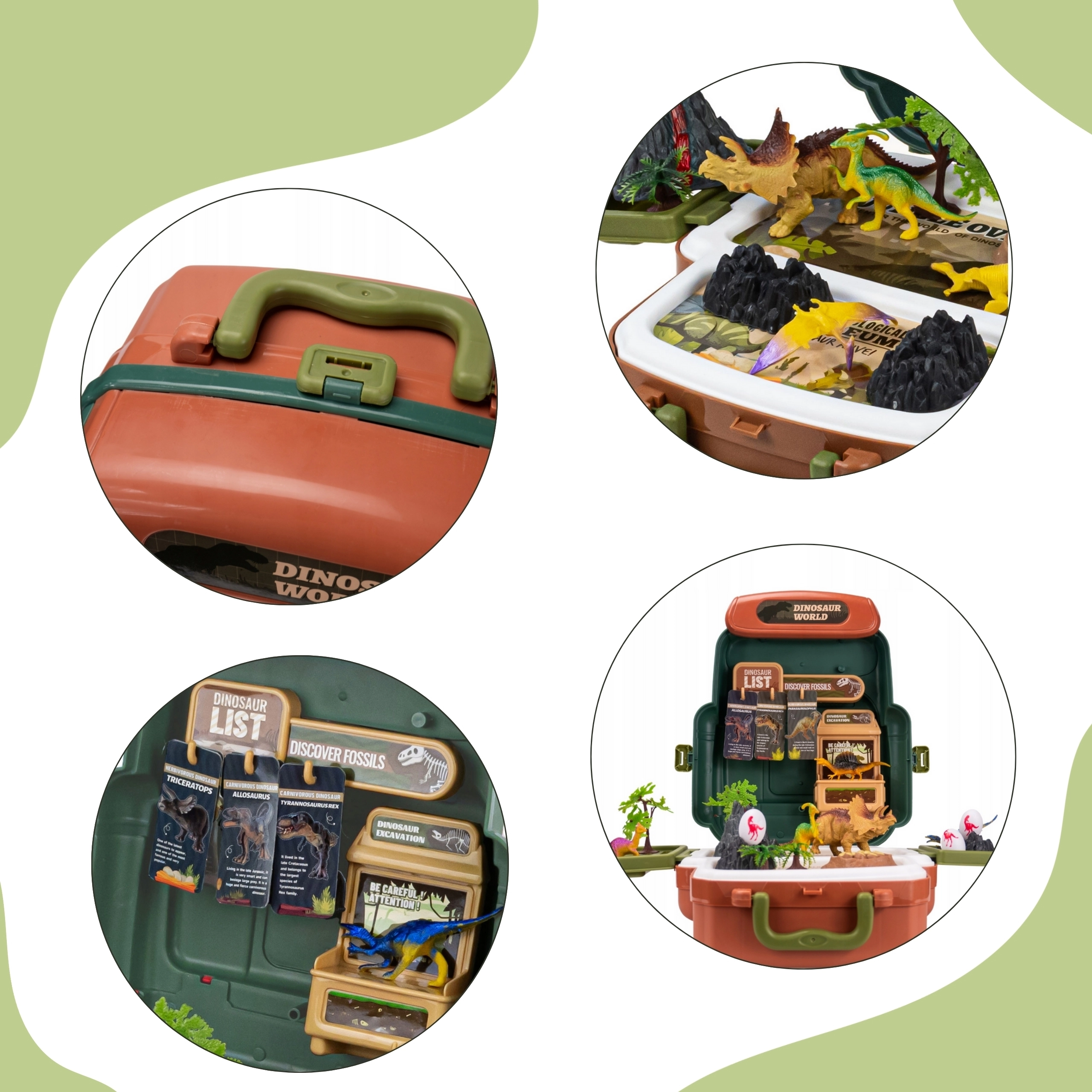Het koffertje verandert na het openen in een mini “Dinosaur World” met vakjes en een scène. Dankzij het handvat is het makkelijk mee te nemen en blijft alles netjes bij elkaar.