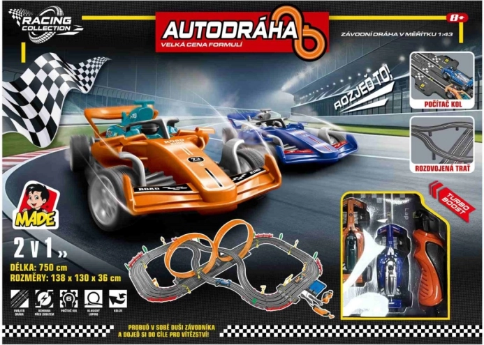Geniet thuis van spannende races met een racebaan met formule-auto’s van 7,5 meter. Een stabiele baan van hoogwaardig kunststof, eenvoudige bediening en een 12 V-adapter in de verpakking zorgen voor hoge snelheid en veel plezier voor kinderen vanaf 3 jaar.