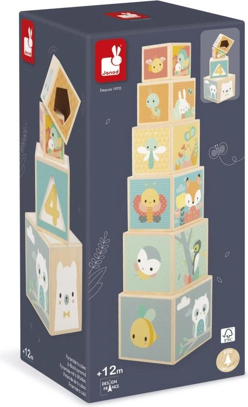 Deze houten piramide van 6 blokken betovert met zachte kleuren en liefdevolle illustraties. Kinderen kunnen de blokken stapelen, sorteren en combineren, waardoor ze de principes van balans, grootte en ruimte beter begrijpen. Elk blok heeft 5 verschillende zijden: een schattig dier, een dier in zijn omgeving, een klein dier op een gekleurde achtergrond, cijfers voor de eerste rekensommetjes en een uitgesneden vorm die bij het samenvoegen van twee blokken een vrolijke afbeelding onthult (bijvoorbeeld een katje in een hart).