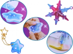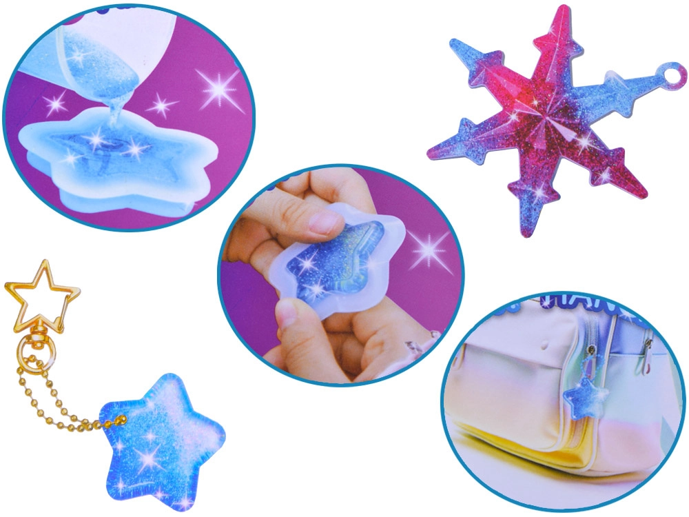 Met deze creatieve set giet je eenvoudig kristalheldere harsornamenten in favoriete vormen – ster, wolkje of hart. Meng de componenten A en B in een verhouding van 1:1, voeg glitters of kleurrijke confetti toe, giet in de siliconenmallen en werk na uitharding af met metalen ringetjes, kettinkjes en kralen. Dankzij de praktische organizer heb je alle onderdelen overzichtelijk bij de hand.