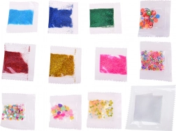 - Glitters, pailletten, kralen in blauw-transparante tinten