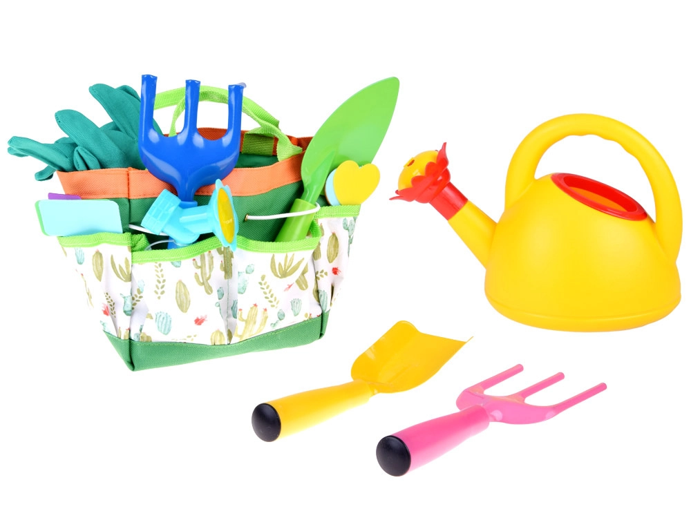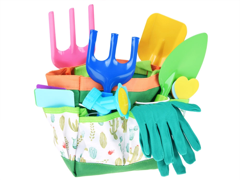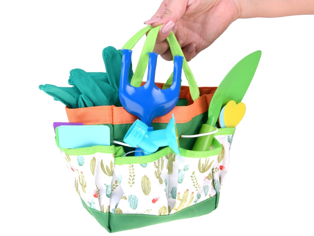 Een complete kinder-tuinierset met een vrolijk cactusmotief die kinderen inspireert om te leren en te spelen in de frisse lucht. Bevat een praktische tas–organizer met vakken, kleurrijk gereedschap voor kleine handjes, een gieter, schort, handschoenen, beschermers en kleurrijke plantenlabels. Ideaal voor graven, losmaken, verpotten en water geven en voor het opbouwen van een band met de natuur.