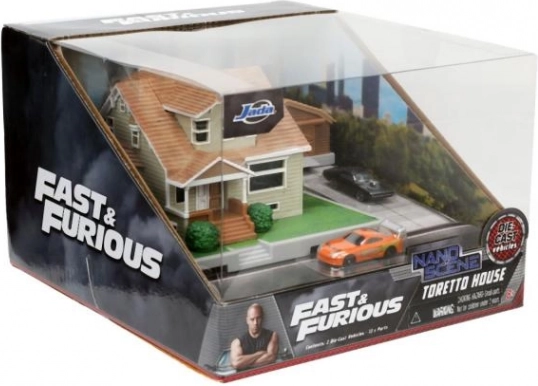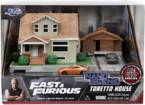 Gedetailleerde verzamel-nanodiorama van het legendarische huis van Dominic Toretto uit de film Fast & Furious met garage, 2 metalen nano-auto’s (Dodge Charger en Toyota Supra), draaibare wielen en rubberen banden. Ideaal als decoratie, voor modelspoorbanen en voor fans van de serie.