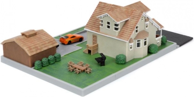 Getrouwe weergave van het Toretto House met huis, garage, oprit en tuin op één voetstuk – ideaal om tentoon te stellen.