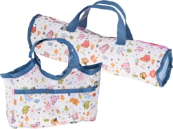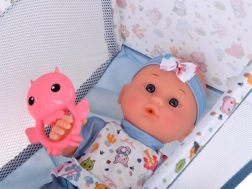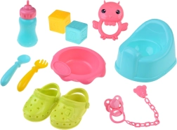 De praktische uitrusting omvat een eetset (kom, bestek en flesje), een potje, fopspeen met ketting, kleurrijke blokjes en een rammelaar. Het reisbedje met ademende gaaszijden en tas is ideaal om mee te spelen en op te bergen. Dankzij de uitgebreide accessoires bootsen kinderen eenvoudig echte babyverzorging na en ontwikkelen ze communicatie en fijne motoriek.