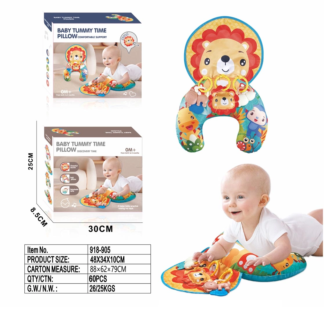 Er zijn drie afneembare speeltjes inbegrepen, die ook aan het ledikant of de kinderwagen kunnen worden bevestigd. De hanger met beertje en paddenstoel heeft een bijtring en rammelaar, de hanger met het leeuwtje bevat een pieper. Dankzij de veelzijdigheid en de zachte vulling is het kussen de ideale metgezel om te spelen, te ontspannen en te reizen.