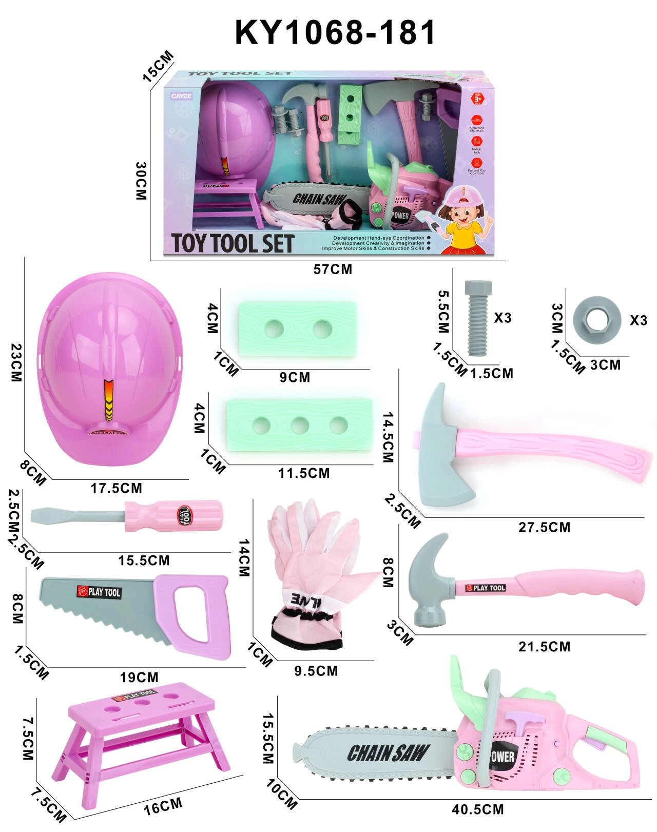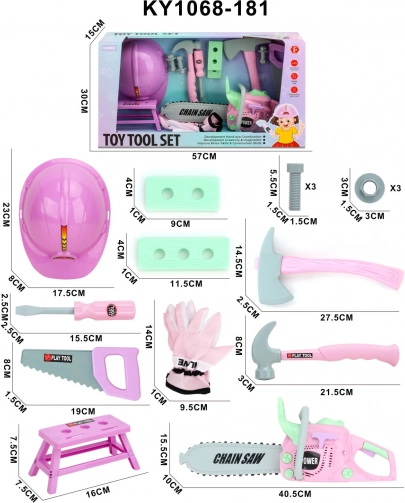 De roze gereedschapsset voor kleine doe-het-zelvers vanaf 3 jaar brengt veel plezier én leren. Bevat een rijk uitgeruste werkset inclusief een kettingzaag met geluidseffecten, helm, gereedschap en een tafeltje – mini-werkbank. Gemaakt van hoogwaardige kunststof met oog voor detail. Ideaal om volwassenen na te bootsen en de fijne motoriek en creativiteit te ontwikkelen.