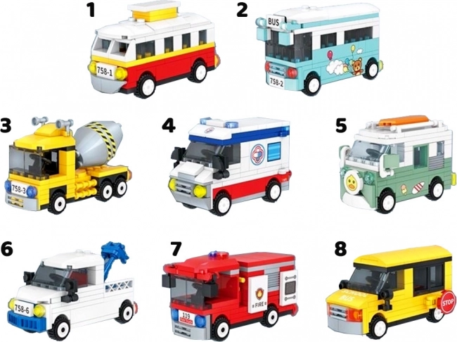 Bouwsets CITY VEHICLE: 8 mini‑modellen van stadsvoertuigen. 83–111 onderdelen, beeldinstructie, motoriekontwikkeling. Prijs per stuk – kies een specifiek model.