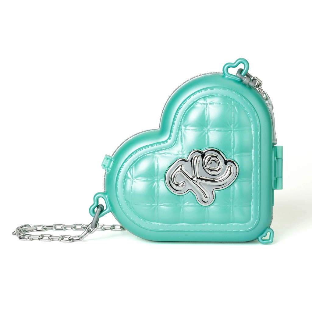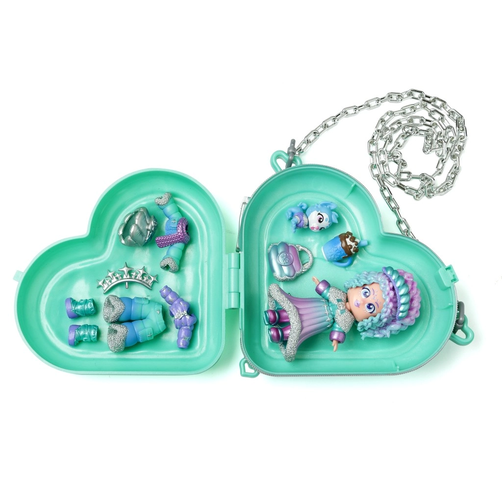 De harde case in hartvorm houdt de pop en accessoires netjes bij elkaar en dankzij de kettingriem neem je hem overal mee naartoe.