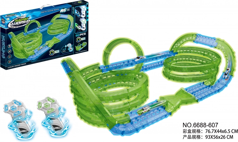 Deze grote lichtgevende racebaan verandert elke kinderkamer in nachtelijke races. De fluorescerende elementen van de baan lichten prachtig op in het donker en de autootjes met LED-lichten zorgen tijdens het rijden voor indrukwekkende lichteffecten. Het bouwen van de baan stimuleert de verbeelding en de fijne motoriek, terwijl het rijden zelf de oog-handcoördinatie bevordert.