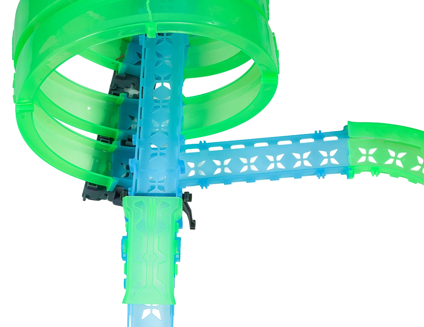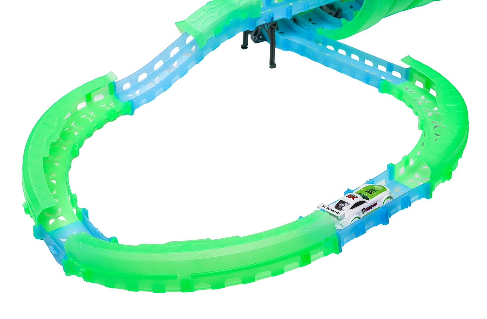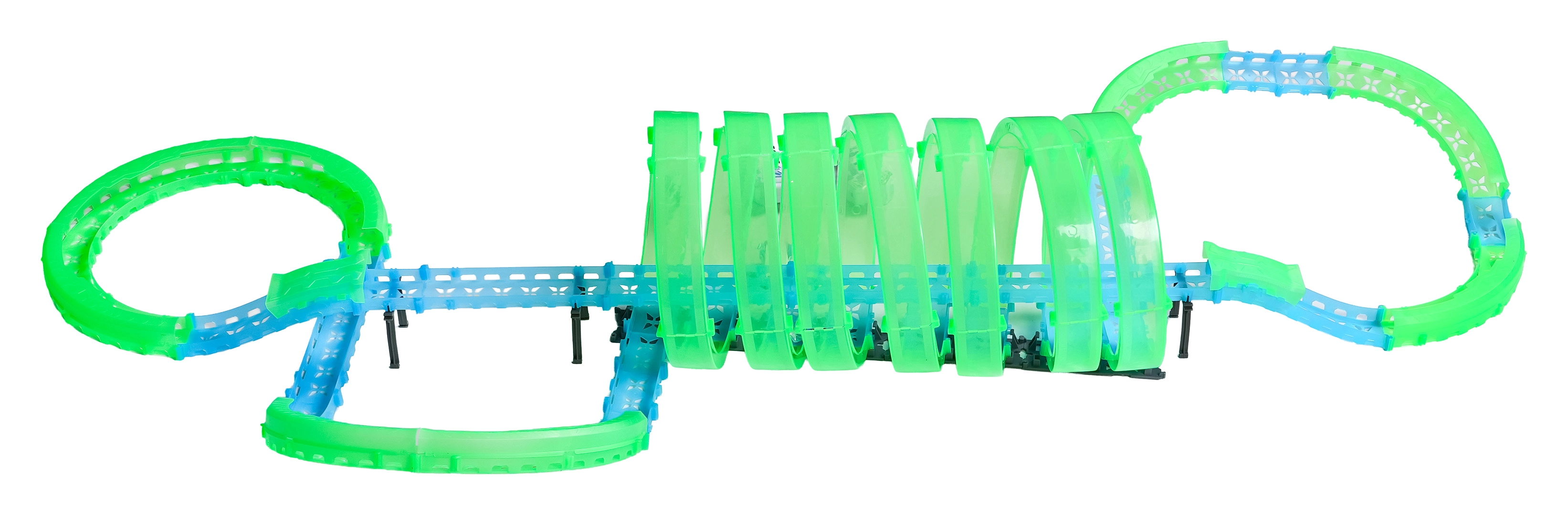 Deze modulaire racebaan van lichtgeleidend materiaal in neongroen en blauw klikt eenvoudig in elkaar en maakt snelle ombouw mogelijk. Het fluorescerende materiaal licht op na belichten en verandert samen met de LED-autootjes de kamer in een betoverende lichtarena.
